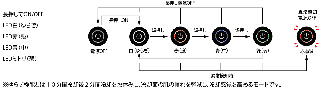 | 長押しで ON/OFF 赤(強)表面温度最大 9°C 青(中)表面温度最大 15 緑(弱)表面温度最大 18°C |